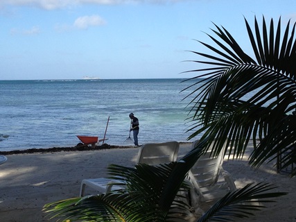 朝パンを食べて水着も着込んで9時半の船には少し早いがビーチへ。プールではもう子どもたちが遊んでいる。ビーチを散歩しスマホでパシャパシャと写真を撮りながら歩く。ホテルスタッフが打ち上げた海藻を掃き集めている。そうこうするうちにボートが逗留されて、家族連れ二組とともに乗り込む。浅瀬に入ってから乗るので、すでにビーチサンダルは水浸しだ。