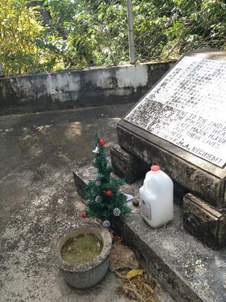 津田さんが平たいお線香を取り出して火を付けながら言った。「これ日本の人にもらったんだけど、火がつきにくいんだよね~」ここにお参りに訪れていた関係者の人たちも皆高齢になって日本から来ることができなくなったそうだ。「だから私ができる間は、ここをお守りさせてもらおうと思ってね」津田さんが言った。燃え始めたお線香に文字が浮き出してきた。南無阿弥陀仏…。私も日本から持参していたお線香を燃やしていいかとたずねると、ぜひにと言ってくれた。母方の祖父が南の島で戦死している。このあたりの小さな島だが、津田さんによると日本からの船は一度サイパン島に上陸してから島々に行ったらしい。「おじいさんもきっとサイパンに来てますよ」と言った。ドライバーの男性が樹からもぎとった緑の柑橘を渡してくれた。スダチのようだが、とても甘くて美味しい。自生しているものらしい。写真でしか見たことのない祖父ももしかしたらこれを食べたかもしれないなと思った。碑の前には小さなクリスマスツリーが飾られている。きっと津田さんが持ってきたくれたのだろう。その心遣いに想いの深さを感じる。やっぱりこのガイドさんと回って良かったなと思う。戦場の跡地でそっとつぶやく「メリークリスマス。そしてみなさんやすらかに」